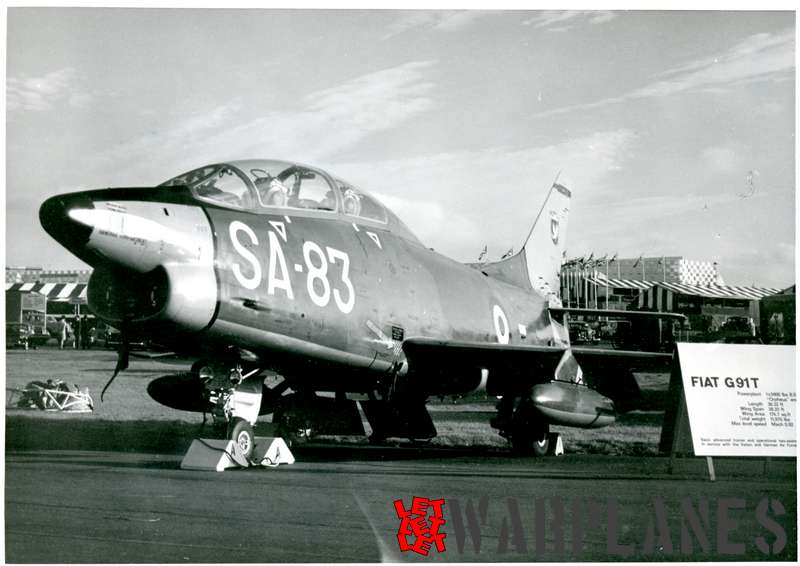 The Fiat G.91 was an Italian jet fighter aircraft designed and built by Fiat Aviazione. The G.91 entered into operational service with the Italian Air Force in 1961, and with the West German Luftwaffe in the following year. Portuguese Air Force also use this type and made extensive use of the type during the Portuguese Colonial War in Africa. Few other countries consider and test Fiat G.91 for possible use.