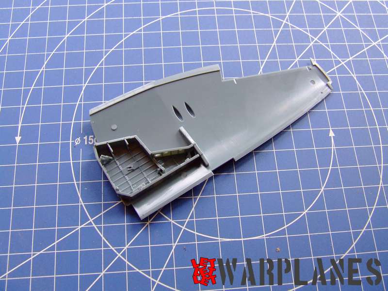 Completed cockpit, alongside with cooler under nose, come inside fuselage halfs.. Before cement it, few elements need to be placed inside one fuselage half. After this is complete, wings is the next step in assembly. Major work is dedicated to top wing elements ( same wings are three parts, one bottom and two top parts), inside have to be cemented wall elements of landing gear bay. Care need there as well each wall is made from six elements and any mistake in positions could cause that it can not proper fit to bottom section. Just little care that all parts seat down into their marked place and to fit each other and good inline. In general, it does not require much time and all complete goes under the fuselage.